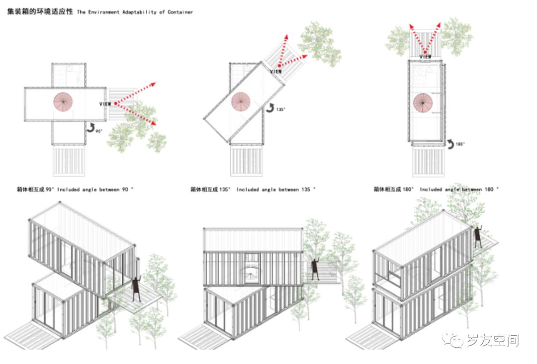 在集裝箱組合式創(chuàng)新方面,可以通過幾個集裝箱,以不同角度,高度來產(chǎn)生一些架空,陽臺,走廊等空間。平面的并聯(lián)、錯位、對角等營造空間。集裝箱常用的集中豎向空間關(guān)系,長短不一,可以產(chǎn)生一些露天陽臺;角度旋轉(zhuǎn),可以產(chǎn)生一些不規(guī)則陽臺與避雨空間,錯位關(guān)系,可以創(chuàng)造不同方向的陽臺。平面拼接是能夠決定集裝箱建筑是否具有魅力的一大原因,空間好不好用,距離感把握的好不好都來源于此。考慮防盜等安全要素,也可以將集裝箱本身的長邊作為良好的屏障。卸下上層的結(jié)構(gòu)構(gòu)件,將下層構(gòu)件轉(zhuǎn)換成可以轉(zhuǎn)動的,從而歇業(yè)時恢復(fù)集裝箱原樣,白天將其打開落地,露出室內(nèi)場景,同時外部的集裝箱板還可以落地形成入口小廣場小空間,供人們在露天休息,喝茶都可以。
